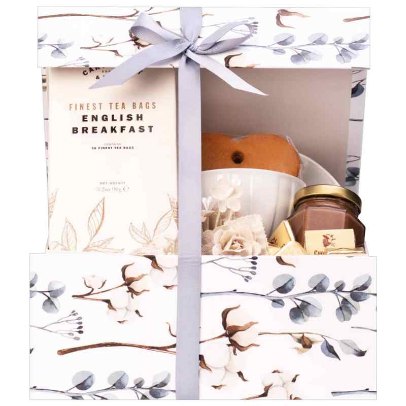 Ručně vyrobená krabička se sezónním zdobením, která obsahuje: šálek z bílého kostního porcelánu 250 ml a sadu talířů (továrna Ćmielów est. 1790), černý anglický snídaňový čaj 90 g, kelímek s oříšky a medem 140 g, pikantní tyčinky a pralinky 56g. Odesláno zavřeno.